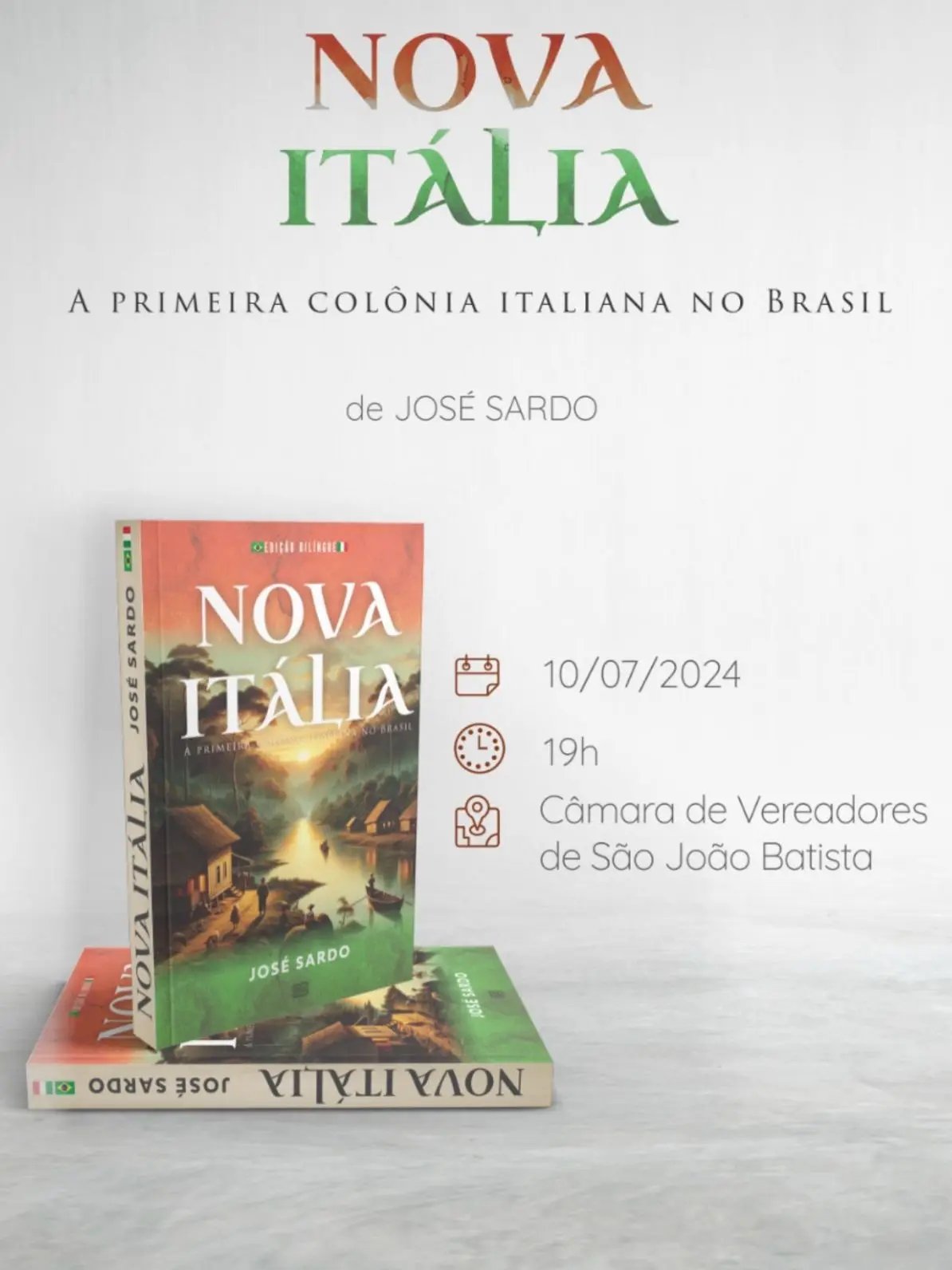 No dia 10 de julho, às 19h, na Câmara de Vereadores de São João Batista, ocorrerá o lançamento do livro "Nova Itália, a primeira colônia italiana no Brasil", do memorialista José Sardo. A obra, fruto de mais de duas décadas de pesquisa, retrata a história da primeira comunidade de imigrantes italianos no Brasil, localizada em Colônia Nova Itália. O livro integra as comemorações do aniversário de 66 anos de emancipação do município.