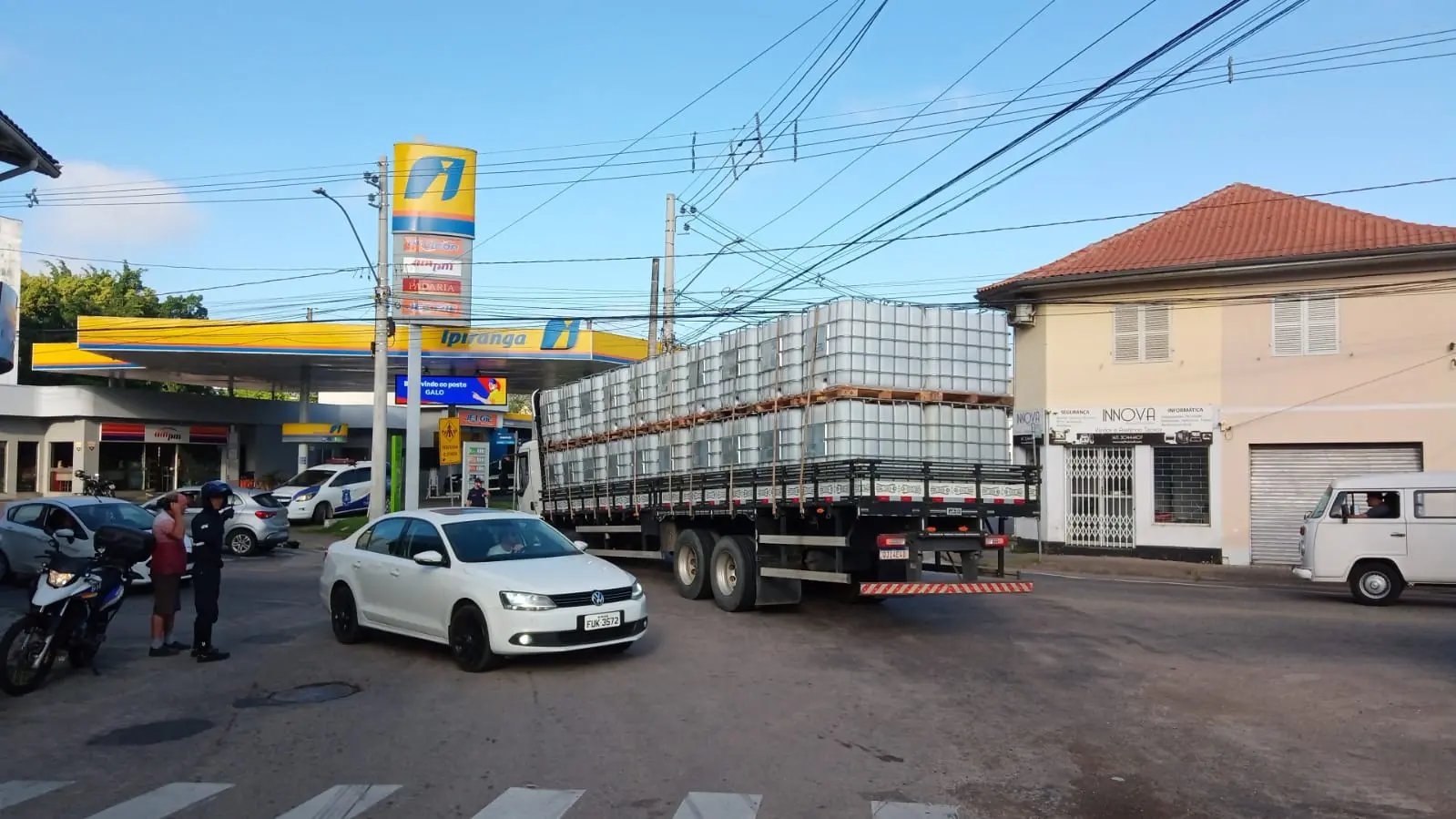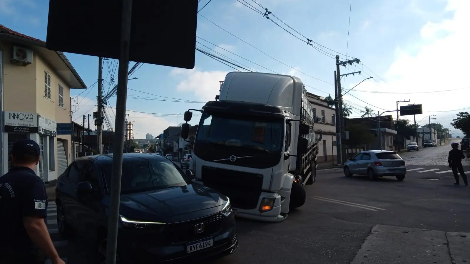 De acordo com a Guarda de Trânsito de Brusque (GTB), o caminhão, com placas Mercosul, que seguia do sentido Rua Tiradentes para Bulcão Viana, quebrou o rodado e bloqueou o cruzamento. A carga do veículo era composta por galões vazios.