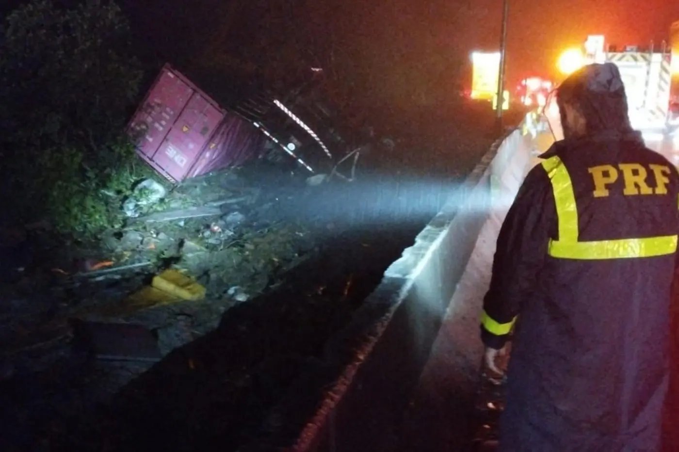 Segundo a Polícia Rodoviária Federal (PRF), uma carreta contêiner que seguia no sentido Santa Catarina perdeu os freios e atingiu uma van, que se chocou contra um carro antes de ser arrastada pelo caminhão para fora da pista. Após atravessar a mureta de proteção, a carreta tombou sobre a van que ficou esmagada.