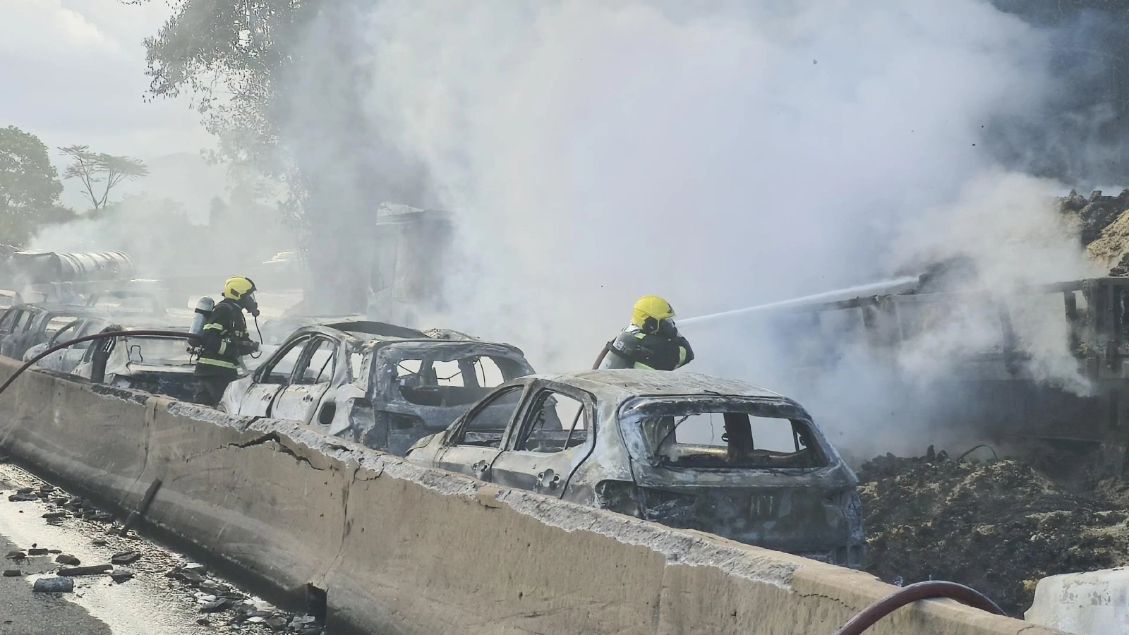 Ao menos 25 veículos e cinco pessoas foram atingidos pelos rastros de fogo da carreta